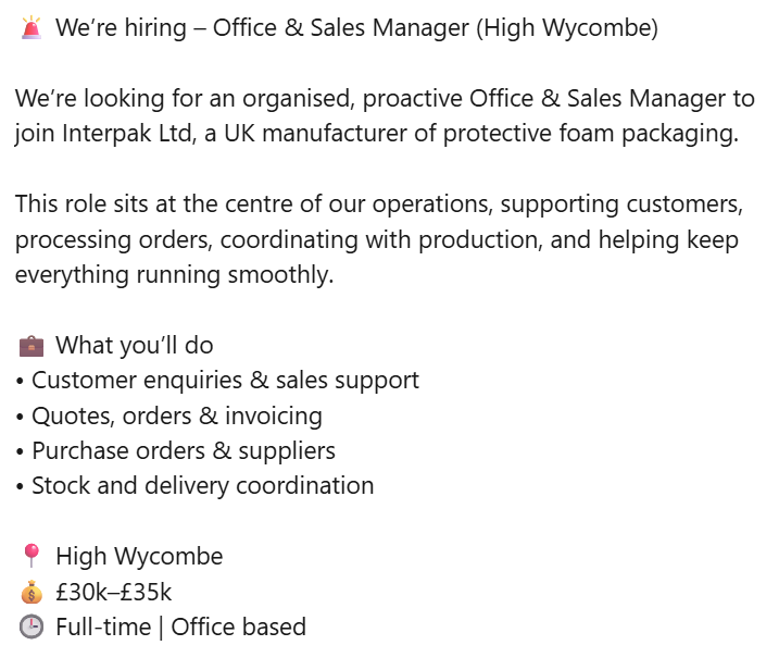 If you would like to be considered for a career with us - please e mail your CV into us at sales@interpak.ltd.uk